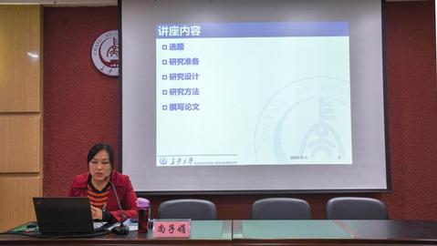 尚子娟从选题、研究准备、研究设计、研究方法、撰写论文五个方面进行阐述,层层递进,深入浅出,为学生如何进行学术研究进行详细讲解。她首先指出,选题是把握科研的第一关,尤其重点关注最新文件政策与热点时事,具备科学性、可行性、创新性。其次她强调了阅读高引用文献的必要性,指出要适当运用文献阅读工具,学术写作文字要精炼生动,遵守学术规范。最后,她对学生提出具体建议,要具有行动力与计划性。