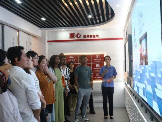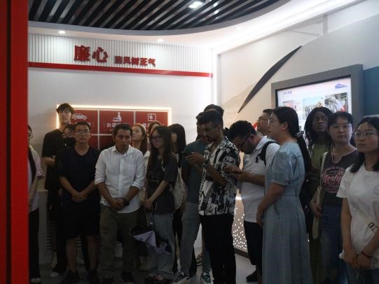 在西安高铁基础设施段讲解员带领下,同学们前往西安高铁基础设施段企业形象展示室进行参观学习。通过对企业大事记、廉政建设、荣誉之光等区域观摩学习,中外大学生们全面了解了企业发展历程,感受中国高铁的现代化发展和高铁人的奋斗历程。