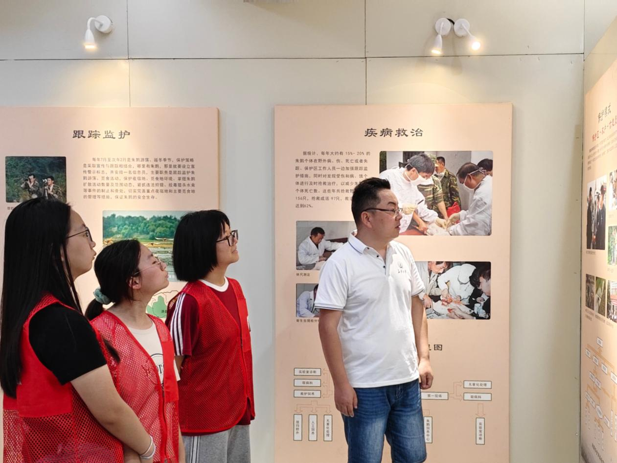 “1981年,7只野生朱鹮在这里被重新发现,如今种群数量已显著增长。”讲解员的介绍,让队员们对朱鹮保护历程有了清晰认识。在朱鹮保护宣教馆,队员们通过图片与故事了解了“就地保护”“野化放归”的措施:人工饲养区的朱鹮幼鸟腿上,白色环志记录着成长轨迹;野化训练则为它们回归自然铺路。