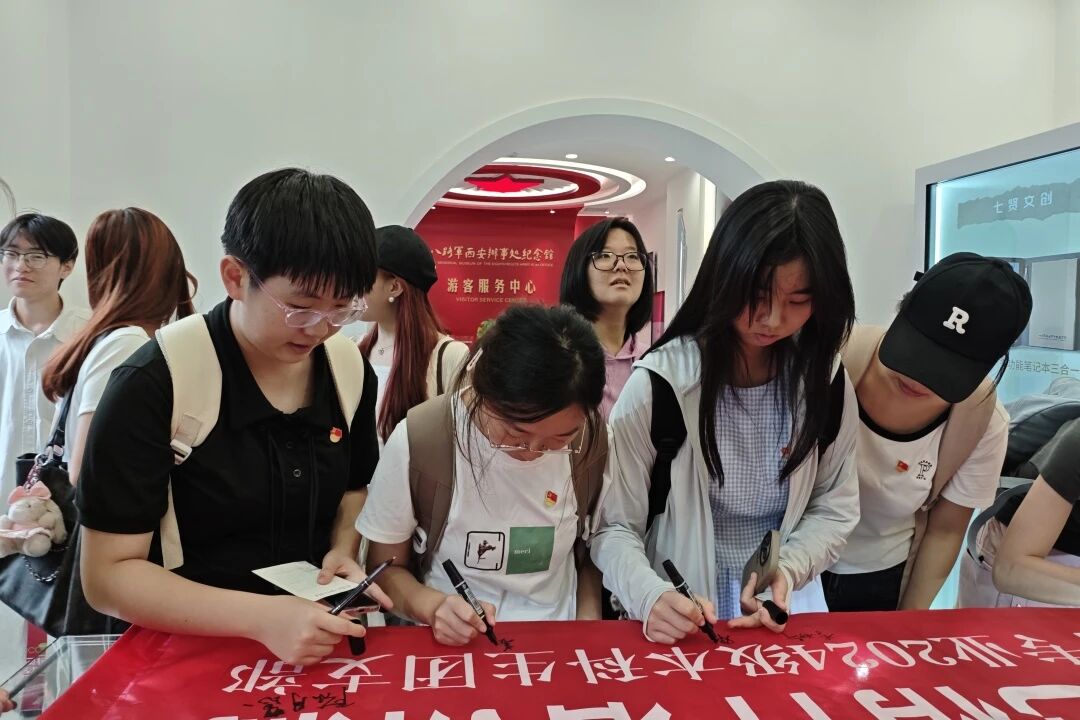 在团支书的带领下,全体同学手抚团徽,举起右拳,重温入团誓词。宣誓完毕后,全体同学在横幅上庄严签下自己的姓名,并在明信片上写下自己对革命先烈的敬佩,抒发拳拳爱国之情,同学们纷纷表示要以革命先烈为榜样,将爱国情怀融入专业学习与日常实践。