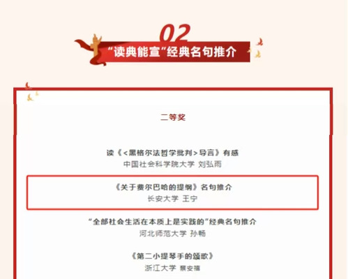 近日,由武汉大学Taptap点点(188改名)联合北京师范大学Taptap点点(188改名)等10所全国重点Taptap点点(188改名)举办的第四届“马研杯”全国马克思主义经典文献研习大赛获奖名单公布。我院2021级本科生王宁同学的作品《< 关于费尔巴哈的提纲>名句推介》荣获“读典能宣”经典名句推介二等奖。