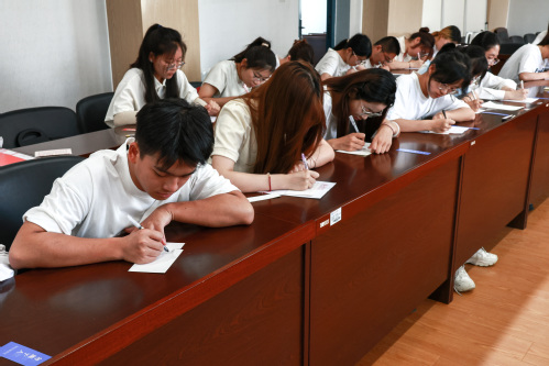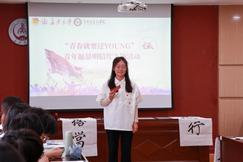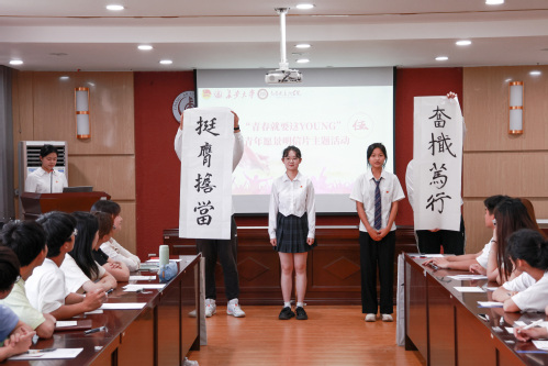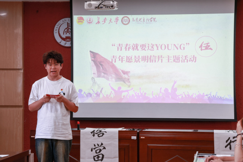 全体成员开展“青春就要这YOUNG”青年愿景明信片主题活动。在场的各位同学以笔墨为媒,在明信片上写下自己的青春抱负和对伟大祖国最真挚的祝福。团支部成员赵楚涵、岑瑶来到台前共同用书法写下“挺膺担当 奋楫笃行”八个大字并分享创作感受。2023级团支部本科生梁俊辉和藏族学生旦增卓嘎分享了自己对祖国的寄语与祝福。