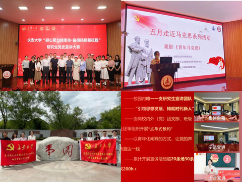 突出党建引领,建强支部堡垒。坚持以党建引领研究生教育培养,对标“百个研究生样板党支部”培育标准,打造“一支部一品牌”优秀案例4项。深入开展学习贯彻习近平新时代中国特色社会主义思想主题教育,承办学校“凝心聚力担使命 奋楫扬帆新征程”研究生党史宣讲大赛,激励研究生在党史学习教育中砥砺品格、坚定信仰;承办学校“五月走近马克思”系列活动,引导广大研究生重温马恩经典,感悟初心使命。深入蓝田、延安等革命老区、西安市警示教育基地等地开展集体研学9次,实现研究生党性修养提升全覆盖。创建星火宣讲团研究生分部,构建本研联动宣讲格局,累计开展学生宣讲活动10余场,受众1000余人,发布宣讲课单56篇。获批校级研究生基层党组织建设项目2项。