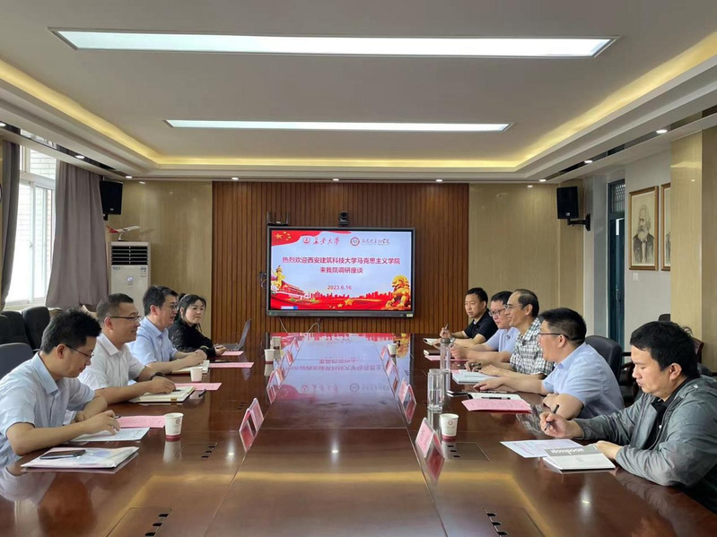 6月16日上午,西安建筑科技大学Taptap点点(188改名)党委书记宋阳、副院长张宏程、中国近现代史纲要教研室教师方泽、自然辩证法教研室教师答凯艳一行4人来我院调研交流,学院院长陈怀平、副院长王立洲、习近平新时代中国特色社会主义思想教研部主任孙百亮、党支部书记杨斌、研究生教学秘书张虽宝参加座谈会。会议由副院长王立洲主持。