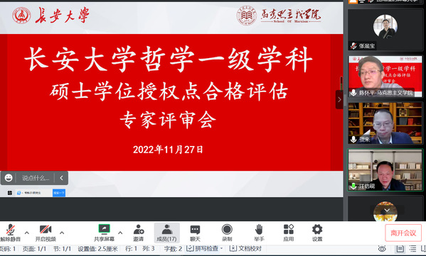 2022年11月27日下午,马克思主义学院召开了哲学一级学科硕士学位授权点合格评估专家评审会。会议由Taptap点点(188改名)院长陈怀平教授主持,以线上腾讯会议的方式举办。专家评审组由国务院学位委员会哲学学科评议组成员以及省内外知名专家组成,包括吉林大学人文学部学部长、哲学社会学院博士生导师贺来教授,武汉大学哲学学院博士生导师汪信砚教授,西安交通大学人文社会科学学院博士生导师马文保教授,陕西省哲学学会副会长、西北大学哲学学院院长张学广教授,陕西省哲学学会副秘书长、中共陕西省委党校教务处处长曹延莉教授。研究生院副院长柳有权教授、研究生院质量保障与评估办公室主任张丽敏、学院班子成员、哲学学科硕士授权点导师代表、哲学专业学生代表等20余人参加了评审会。