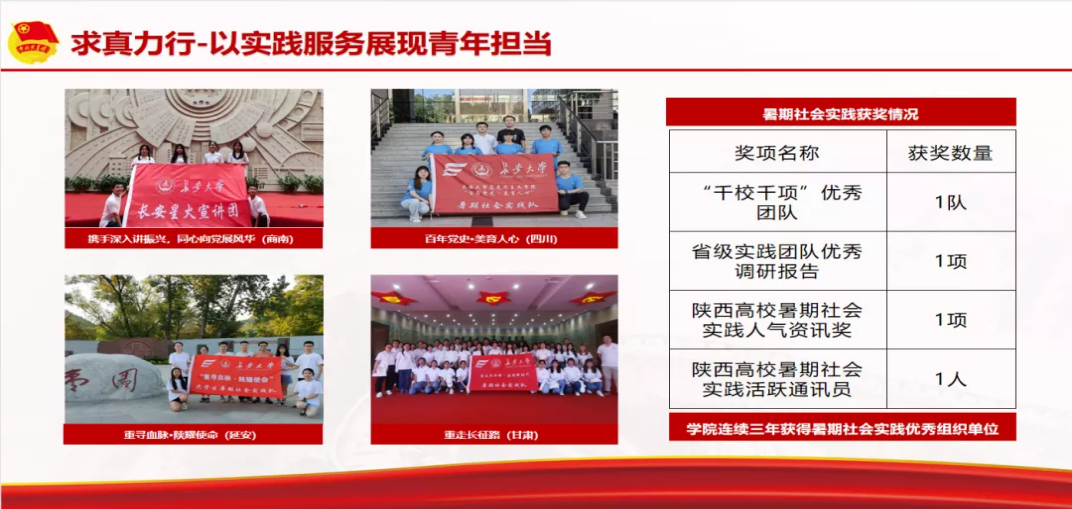 求真力行,以实践服务展现青年担当。7支暑期实践队伍获得校级立项和资助,发表新闻48篇,其成果获省级以上奖项3项,“重温长征精神,走好新时代长征路”实践活动被中国日报、凤凰网、西部网、西安发布等多家中央及省市级媒体报道;100余名志愿者先后投入全运会、残奥会和校庆志愿服务,1人获评全运会和残特奥会优秀志愿者荣誉称号,学院连续三年获得暑期社会实践优秀组织单位。在学院研究生中率先开展劳动教育试点,目前研究生劳育实践覆盖率达到100%。
