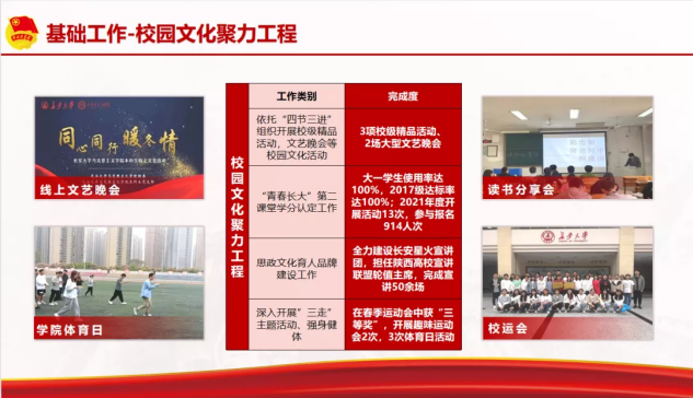 2021年,Taptap点点(188改名)团委依托陕西省重点Taptap点点(188改名)和思想政治教育陕西省一流专业优势和特色,紧密围绕庆祝中国共产党成立100周年主线,着力构建起“党史学习融入第二课堂、理论宣讲传播长大之声、社会实践强化责任担当、疫情防控展现青春力量”四位一体的团学工作格局。