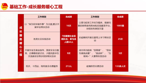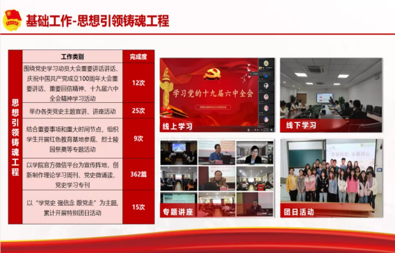 学院团委围绕四项工程,助力青年成长成才。铸魂工程聚焦理论学习,以线上线下相结合的方式开展学习活动,确保思想政治教育“不断线”;暖心工程聚焦学生维权服务和志愿活动,为其成长成才提供平台;聚力工程聚焦校园文化供给,促进学生全面发展;强基工程聚焦团组织基层建设与团学组织改革,以学院第一团代会和学生团干部素质能力大赛为抓手,增强学院团委三力一度。
