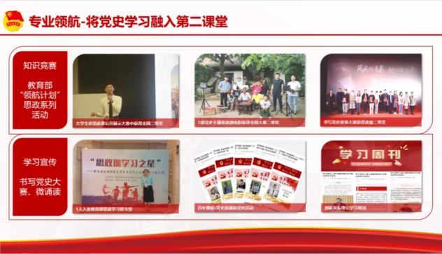 专业领航,将党史学习融入第二课堂。以党史学习教育为重点,形成了“以赛促学涨知识、多维宣传浓氛围、精品活动促力行”的三维党史学习模式。
