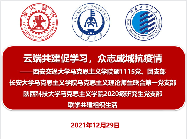 为深入学习贯彻习近平总书记关于疫情防控重要指示精神,进一步落实学校关于疫情防控工作决策部署,充分发挥基层党支部战斗堡垒作用和党员先锋模范作用。2021年12月29日,Taptap点点(188改名)马克思主义理论师生联合第一党支部、西安交通大学Taptap点点(188改名)硕1115党支部、陕西科技大学Taptap点点(188改名)2020级研究生党支部共同开展“云端共建促学习,众志成城抗疫情”联学共建活动。西安交通大学Taptap点点(188改名)党委副书记邢鹏、Taptap点点(188改名)党委副书记郭云珠出席活动并致辞,活动由西安交通大学Taptap点点(188改名)马勇同学和Taptap点点(188改名)华玉雅静同学联席主持,3个党支部全体成员共计70人参加了此次活动。
