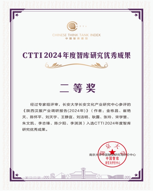 论坛发布了CTTI 2024年度智库建设最佳案例与智库研究优秀成果的征集推介结果、CTTI 2024年度增补来源智库名单。我院《陕西汉服产业调研报告(2024年)》荣获CTTI 2024年度智库研究优秀成果二等奖,长安文化产业研究中心入选“中国智库索引”(CTTI)来源智库,实现历史性突破。