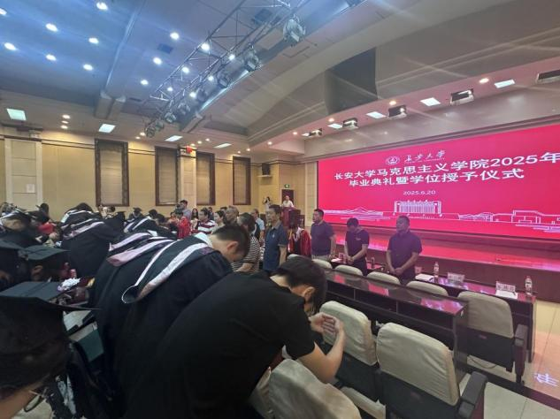 研究生毕业生代表李志峰主持谢师礼,全体毕业生面向老师们深情三鞠躬,感谢老师们的悉心栽培与殷切嘱托。