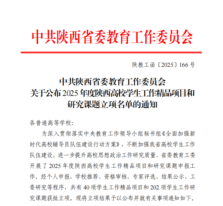 近日,中共陕西省委教育工委公布了2025年度陕西高校学生工作精品项目和研究课题立项名单。我院申报的《“一体三翼六融合”:行业特色型高校“大思政课”实践育人模式的探索与实践》获批学生工作精品项目立项。