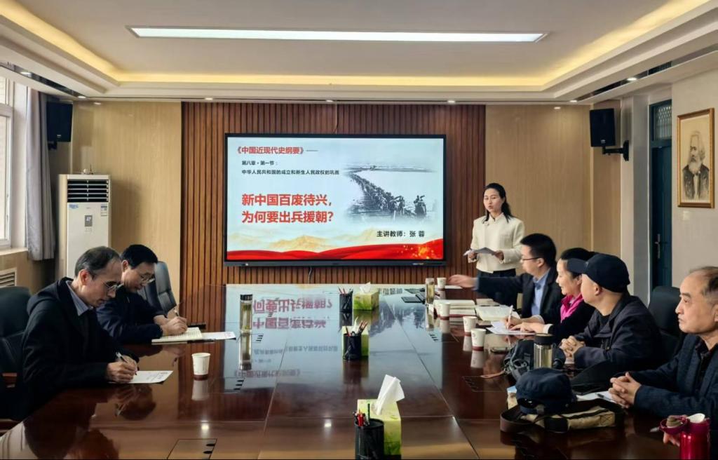 会上,副院长王立洲对学院集体备课制度的总体运行情况进行了简要汇报。教研部主任余猛介绍了中国近现代史教研部集体备课活动的基本理念、具体做法以及取得的成效。张蓉老师围绕《中国近现代史纲要》第八章第一节:“中华人民共和国的成立和新生人民政权的巩固”的内容,以“新中国百废待兴,为何要出兵援朝?”为切入点进行教学展示,从“生存”“发展”“地位”三个维度对授课内容做了详细阐述和解读。