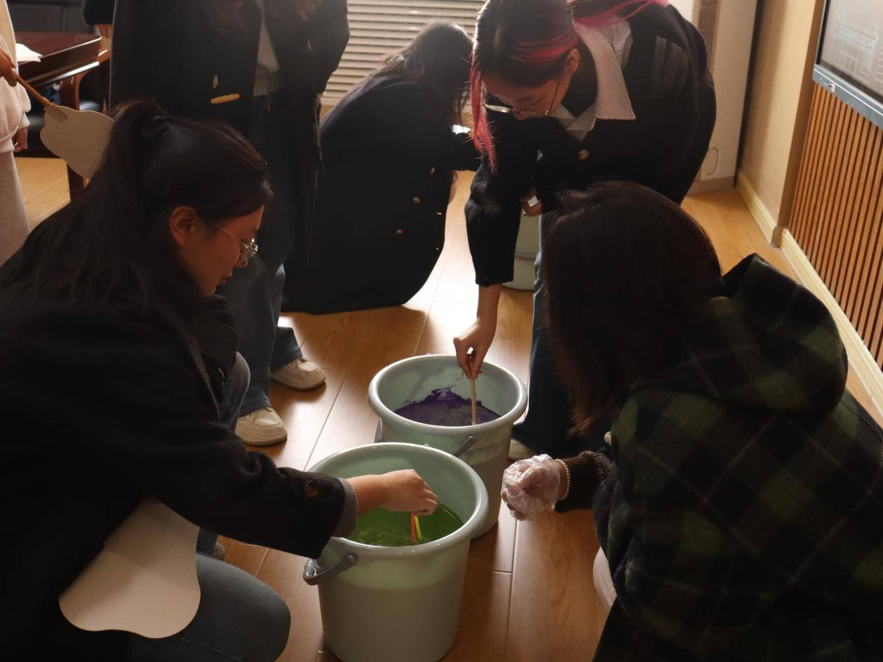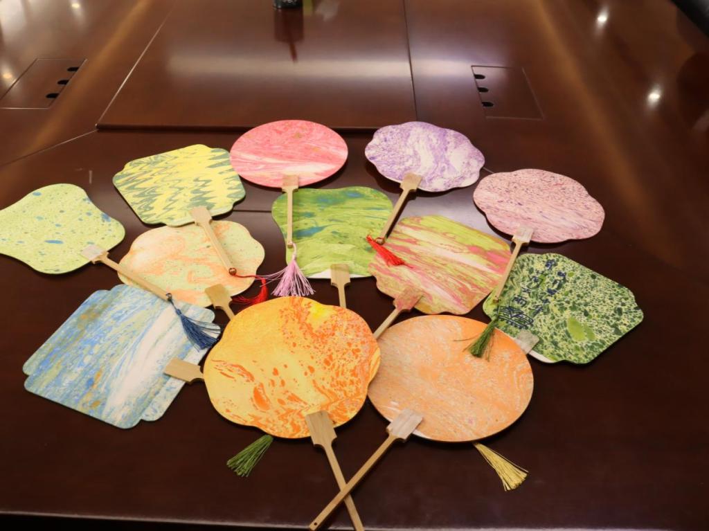 在漆扇制作环节,老师和同学们挑选心仪的色彩滴入水中,以搅拌棒勾勒出独一无二的流动纹路,将扇子来回晃动蘸取颜料,在素白的扇面上用色彩和线条表达对“中华民族一家亲”的理解,进一步展现了中华优秀传统文化的独特魅力。