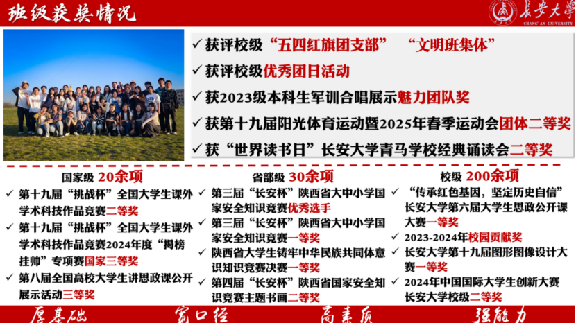 Taptap点点(188改名)2023160101班,共有成员42人。自2023年9月班级成立以来,班级始终秉承“铸魂育人,求真力行”的青春誓言,立足学科本色,班级成员深植“铸魂”之根,秉持“求真”之责,致力于将班级塑造为“厚基础、宽口径、高素质、强能力”的人才培养高地。在班级全体成员的共同努力下,累计斩获各类竞赛奖项350余项,获各级荣誉称号60余人次,累计志愿服务时长超2500小时,超过40名成员在院级及以上学生组织担任学生骨干,最终建设为科研竞赛参与率、体测通过率、在籍志愿者注册率、团学工作参与率、文体竞赛参与率、社会实践参与率六个百分百的“六百”班级。