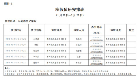 4.注意学院值班安排。为更好地服务师生,保证各项日常业务和服务性工作正常有序运转,学院制定了寒假轮休期间的值班安排表(值班安排表见附件2),具体值班时间为上午8:30—11:30,下午14:30—17:30,节假日和周六、周日正常休息,请大家在值班时间或提前预约办理业务。